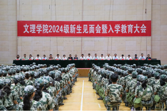 9月8日晚,文理学院2024级新生见面会暨入学教育大会在体育馆主馆隆重召开。院领导班子、系主任、全体新生辅导员、2024级全体新生、新生班助及军训教官参与会议。会议由院党委委员刘家豪主持。