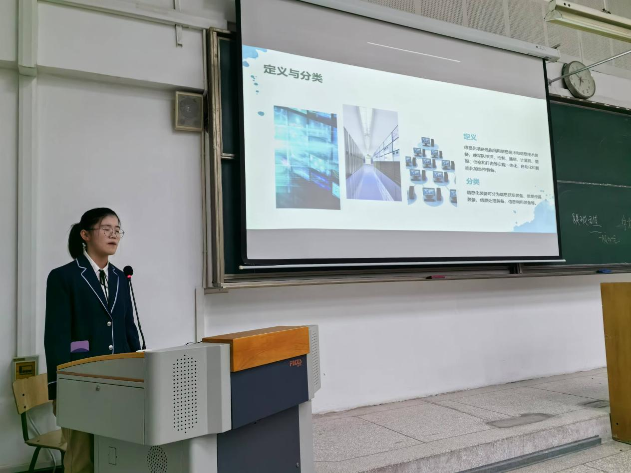 会上,24物理1班学生结合自己所学的理论知识向班级同学阐释了信息化装备的定义、分类,介绍了军用卫星、载人航天器、天基武器系统的特征,梳理了国家研制核武器的发展历程,为同学们呈现了一场展现国防装备的视觉盛宴。